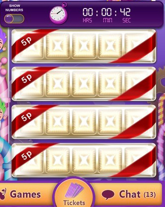 Tickets sold at 52-5 bingo games each contain 5 playing candies out of the standard 52 numbers. The cards are revealed immediately upon ticket purchase.